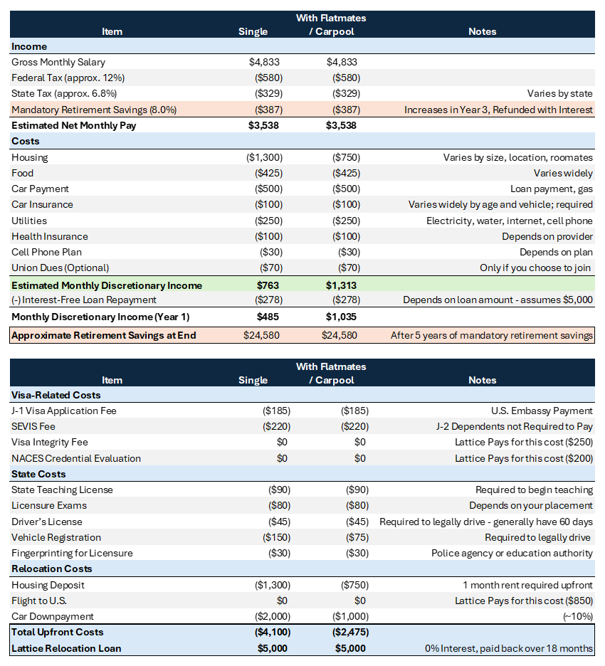 The outline below shows an estimate of the salary, taxes, living costs, and relocation costs a teacher in the program could expect, whether living alone or matching with flatmates in the Wonderlink program.